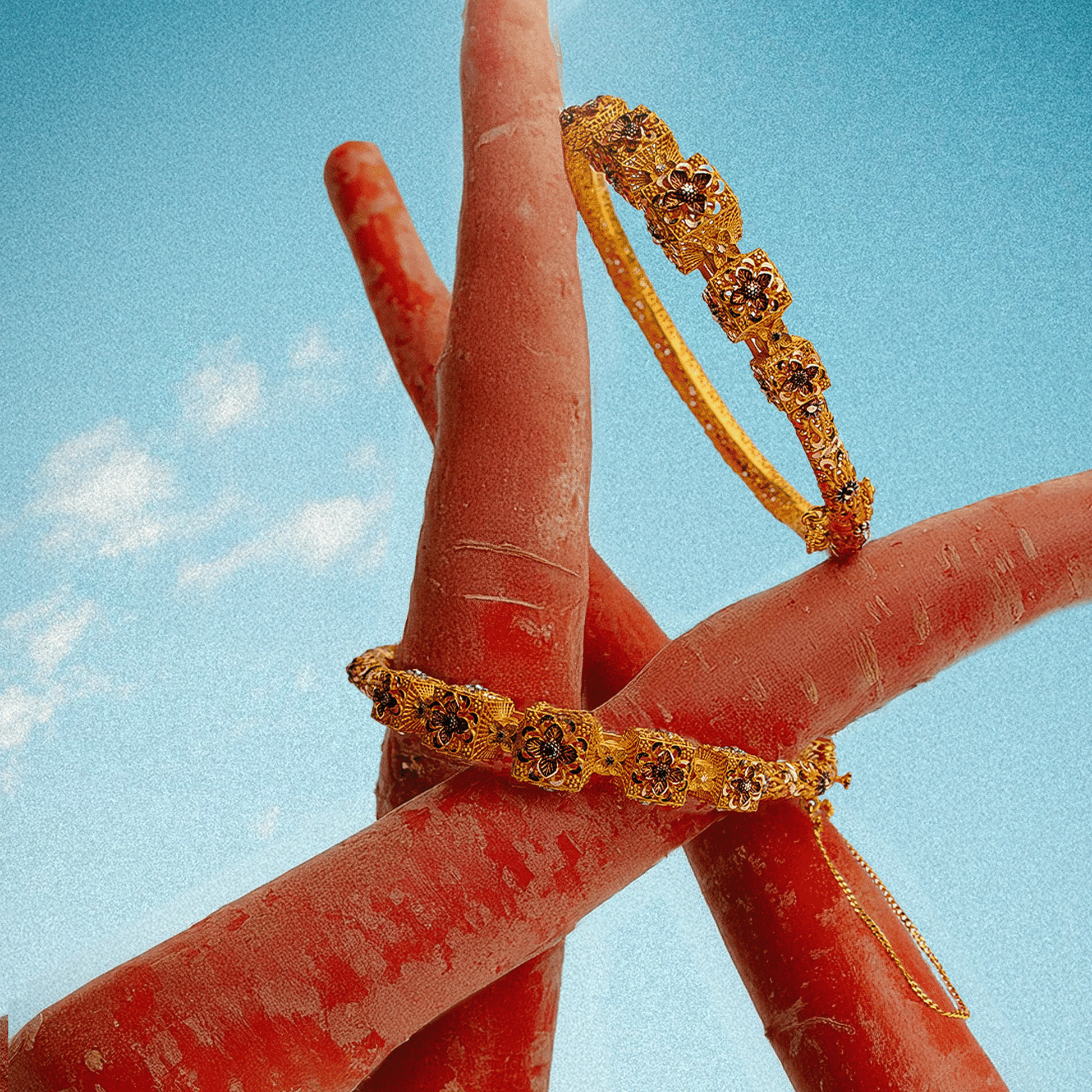 Square-motif gold bangles where strong lines meet subtle floral details, creating a balanced design that is both striking and graceful.