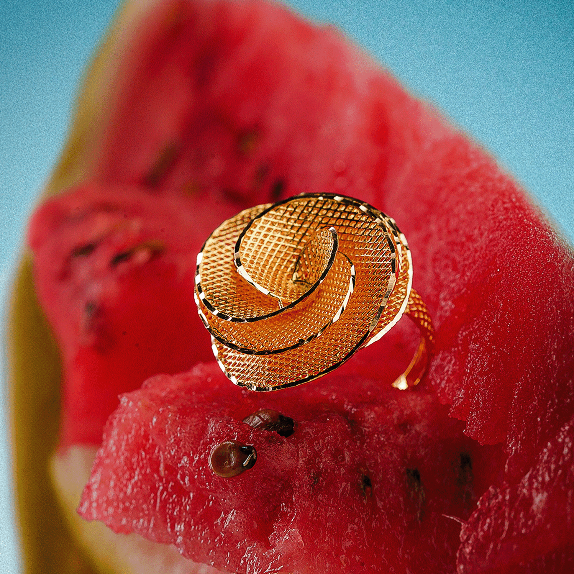A gold ring featuring an elegant mesh design, combining texture and flow for a striking yet refined appearance.