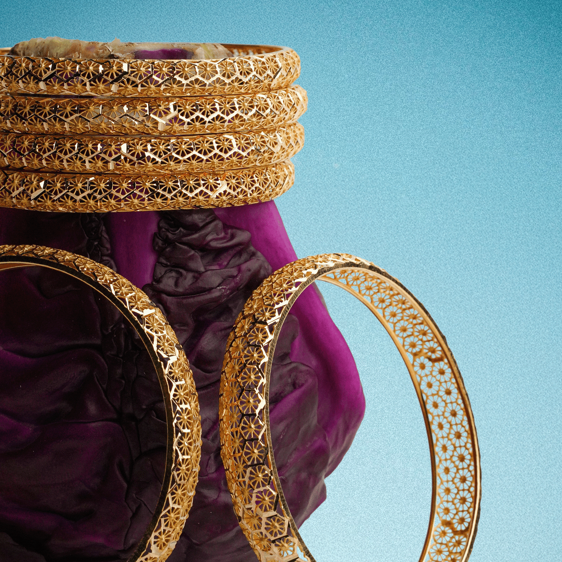 Gold bangles adorned with engraved floral patterns, where intricate detailing meets flowing curves to create a bold yet graceful statement on the wrist.